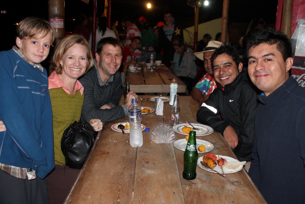 And the pay-off for gritting my teeth through these dubious situations was walking through a gigantic cathedral of bamboo arcing over a clear river. Not bringing snacks on our hike because we could just reach up and pick mandarinas, guavas or granadillas from where we stood. The homemade meals of Viannay (our hostess) featuring fresh-squeezed juices, just-plucked chickens roasted in a fire-fueled asada oven, fresh-made arepas, soups swimming in rice and cilantro, eggs laid that morning and chocolado that we helped make. Learning to dance tropicales from Leo, a tough Colombiano of both indeterminate age and position in the household (husband? boyfriend? employee?) whom I topped by a good four inches. An entire family who patiently waited for us to find the right word, ignored the complete lack of tenses or grammar, and slowed their stories to a four-year-old’s pace. Watching Jack and Juan Jose, a semi-adopted 12-year-old son of our hostess play game after game — board, video and physical — with about 10 words in common. The sunsets. The endless waves of green mountains. The half moon, hanging low in the sky. Yes, even the chickens, whose patriarch insisted on marking each hour of the entire night, not merely the sunrise, directly outside my window.