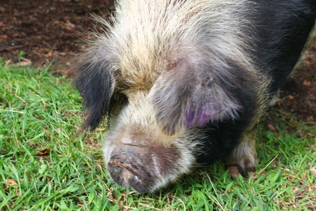 Victoria, Nicolas’ supposed-to-be-pygmy pig who spends her days napping and Hoovering up fallen guavas and oranges.