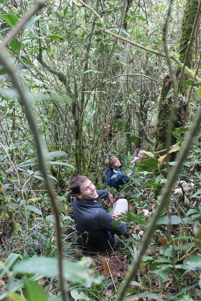 You know that scene in Romancing the Stone where Michael Douglas and Kathleen Turner — in order to escape from bad guys — slide out-of-control down a leafy tunnel in the jungle, landing in a river? After hacking our way straight up a hill, we descended the same “fun” way, albeit without the river landing. I believe we could all accurately estimate the precise amount of leaves and twigs in Kathleen Turner’s underwear after that scene.