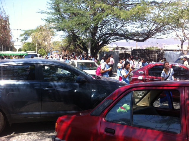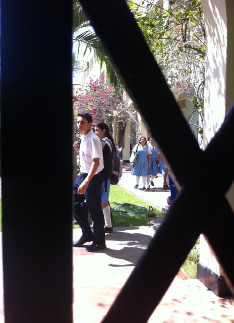 The school is shaped like a figure-eight: white stuccoed columnades surrounding two bouganvilla-filled courtyards, one for the primario (up through grade 5, which is Jack’s year) and the other for the bachillerato (grades 6-11; Retta is in septimo or 7th). Inexplicably, the high school courtyard is peppered with heron and mushroom yard ornaments. From its founding in the 1880 until two or three years ago, Colegio de la Presentacion was a girls’ school; now the ratio is about 4 or 5 to 1, girls to boys. There are 5 boys in Jack’s class: Santiago, 2 Nicolases, Manuel and Jack. There are only 3 boys in the other fifth grade class; he doesn’t know their names but just calls them “the puppies” and laughs. It is not clear why. The juxtaposition is sharp; a few boys looking like well-dressed computer programmers in their navy slacks, white button-down, leather belt and polished shoes, surrounded by flocks of girls in blue plaid pinafores, the older ones looking like full-grown women dressed as little girls for Halloween.