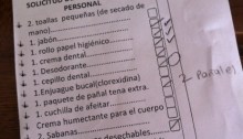 I squint at the list in the dark hallway, because the lights are turned off in this place that aspires to the name “hospital.” These are the items I am to bring: