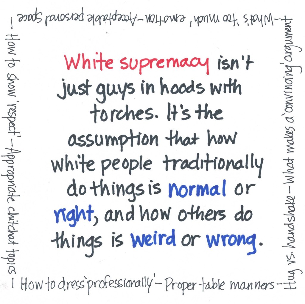 So I’m hoping we’ve been doing this long enough that you’re ready for the big one: white supremacy. Most of us associate the term with men with torches and alt-right threads on the edges of Reddit. But that’s just the visible tip of the iceberg; below the surface is a giant mass of rules and systems based on the idea that white people and the way they do things are inherently better than the way other people do things. White supremacy is so deep and so hard to face that this is where most white people step out of conversations about race. It is incredibly uncomfortable to explore how we’ve been programmed to think about white as “better” in a million ways, large and small. Every conversation about white supremacy triggers defensiveness in me. It helps me to remember that I didn’t build the system even though I benefited from it. And now it’s my job to dismantle the system so that all the kids I know who don’t happen to be white have the same opportunities as my kids.