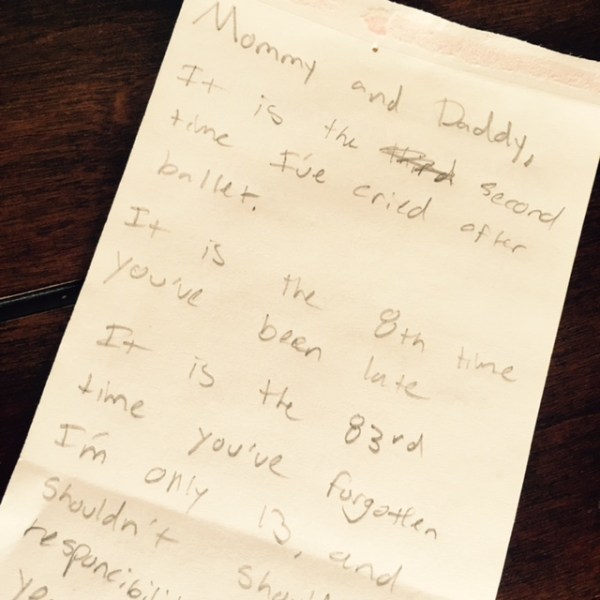 Here is the full text of the letter my daughter left on the dining room table after I forgot to pick her up at ballet lessons for the third time: Mommy and Daddy, It is the second time I’ve cried after ballet. It is the 8th time you’ve been late. It is the 83rd time... Continue Reading →